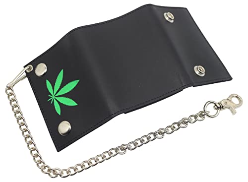 MARSHAL Marijuana Leaf Men's Tri-fold Biker Cowhide Leather RFID Blocking Steel Chain Wallet Snap closure (Marijuana Leaf) 5