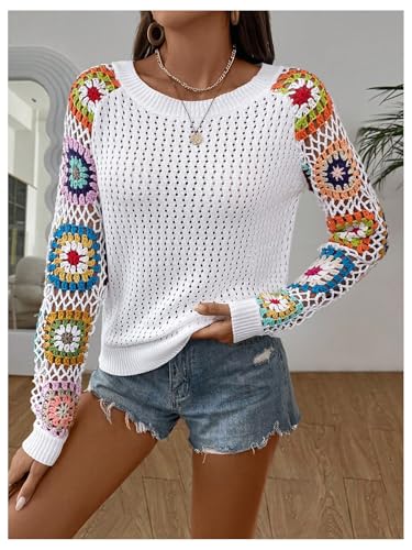 MakeMeChic Women's Floral Long Sleeve Crochet Sweaters Round Neck Hollow Out Knit Tops 6