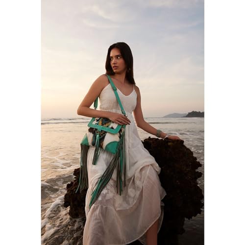 • UPCYCLED FASHION BAG - The front also features beautiful upcycled woven rug, framed by amazing turquoise leather. Leather fringe drapes from either side in matching turquoise. The interior features a zippered pocket and zipper close top, while there's an extra zippered pocket on the back. The matching detachable leather shoulder strap is fully adjustable. A wonderful bag!