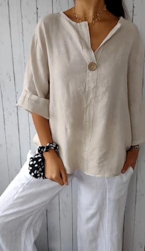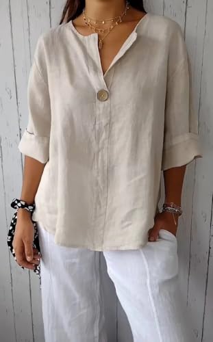 More information about Women's Linen Shirt Button Down V Neck Solid Blouse 3/4 Sleeves Casual Loose Fit Tunic Tops Summer T Shirts