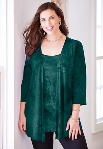 • The look of a twinset in one easy piece. Cardigan features an attached tank for a lightweight layered look. Soft textured jersey knit has a beautiful scattering of sequins for a style you’ll love to wear all season long over pants or jeans.