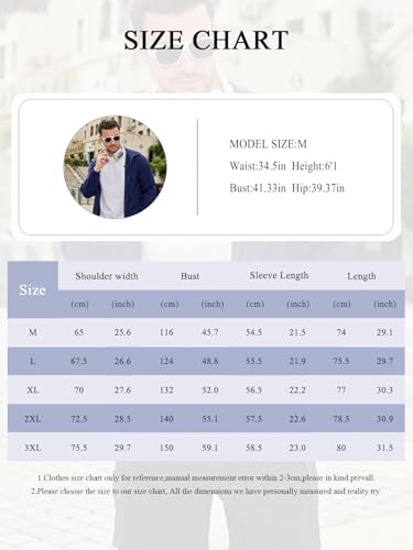 • [Precise Dimensions] - Mens windbreaker available in full sizes from M to 3XL, each size is marked with accurate chest circumference (45.7-59.1 inches), shoulder width (25.6-29.7 inches), and garment length (29.1-31.5 inches) data. You can match your body shape by purchasing with reference to the size chart, avoiding the embarrassment of being too big or too small, and easily finding your exclusive fit.