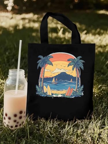 Canvas Tote Bag, Ocean Surf Sunset Mountain Coconut Tree patterned Canvas Tote Handbags for Women Shoulder Bag, 1