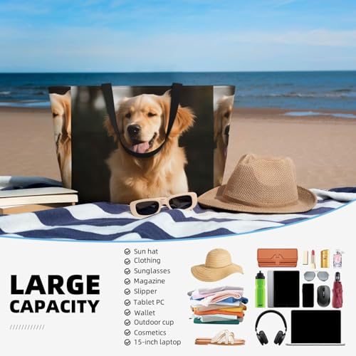 HOT ! Beach Bags For Women Large Waterproof Sandproof Beach Tote Bag Lightweight Zipper Carry On Bag Golden Retriever Dog Pool Bag For Gym Travel Vocation