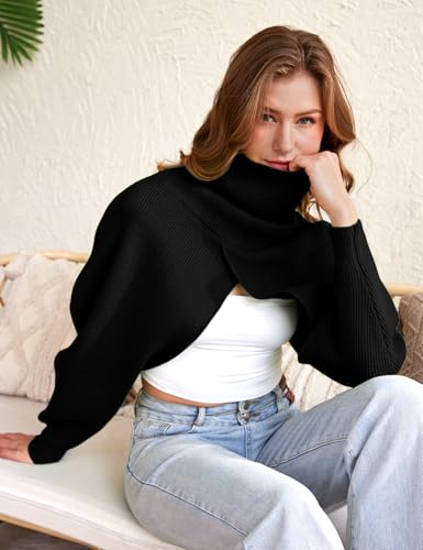HOT ! Wyeysyt Bolero Sweater for Women Turtleneck Cropped Knit Shrug Long Sleeve Open Front Backless Pullover Y2K Tops(Black-L)