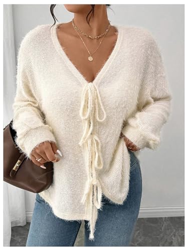 • Features: Plus size, tie front, deep v neck, semi-sheer, long sleeve, drop shoulder, solid color, loose fit, fuzzy cardigan sweaters for women