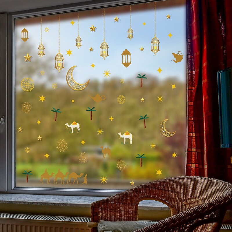 HOT ! Ramadan Festival 2 Pcs Moon Lantern Star Wall Decal Paper Static Sticker Glass Sticker Window Double-sided Visible Decorative Wall Decal Muslim