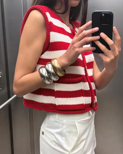 Locachy Women's Gold Button Down Striped Sweater Vests Crew Neck Sleeveless Knit Crop Tank Tops 6