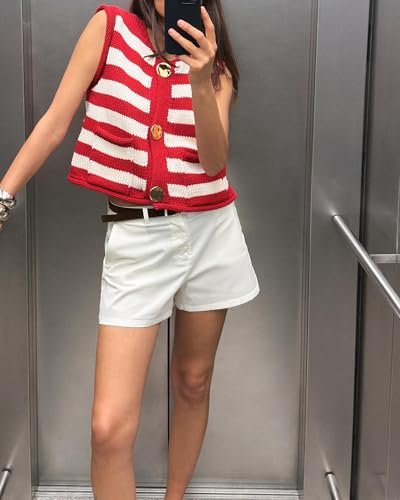 Locachy Women's Gold Button Down Striped Sweater Vests Crew Neck Sleeveless Knit Crop Tank Tops 5