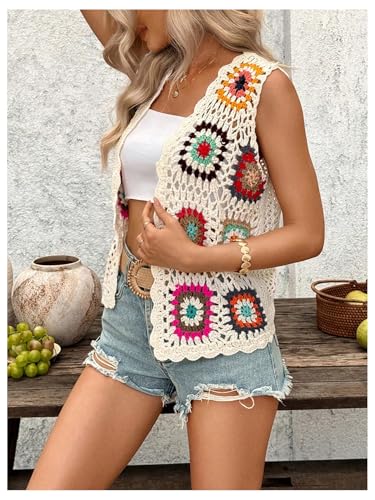 SHENHE Women's Floral Crochet Cardigan Lightweight Sleeveless Open Front Crocheted Sweaters 6