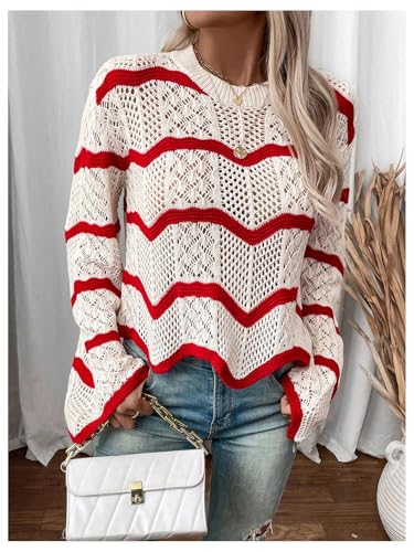 MakeMeChic Women's Crochet Top Chevron Bell Sleeve Crew Neck Hollow Out Long Sleeve Sweater Shirts 6