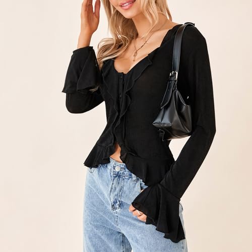 HOT ! Women Y2K Long Sleeve Ruffle Crop Top Flare Long Sleeve V Neck Button Down Cardigan Cute Going Out Tops Streetwear