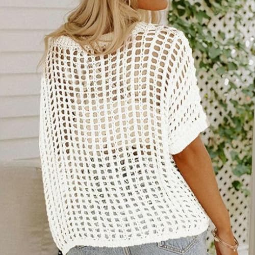 Thrivenget Tops, Womens Summer Scoop Neck Short Sleeve Sweater Casual Crochet Hollow Out Knit Tops Pullover Shirts 1