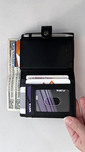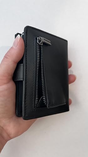 • A lightweight and very durable aluminum cardholder is integrated into the wallet, which holds 5 embossed cards or 8 non-embossed cards. The wallet can hold a minimum of 14 non-embossed or 11 embossed cards. There is a place for a driver's license / identity card.