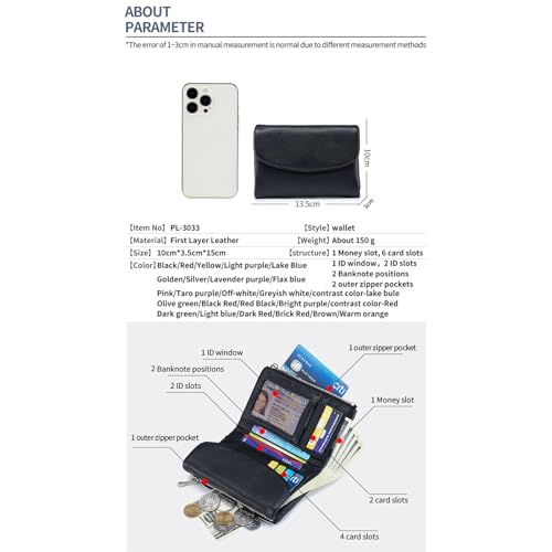 • 【Optimized Storage Capacity】Six card slots and two ID windows; Spacious cash compartment; Two secure zippered coin pockets