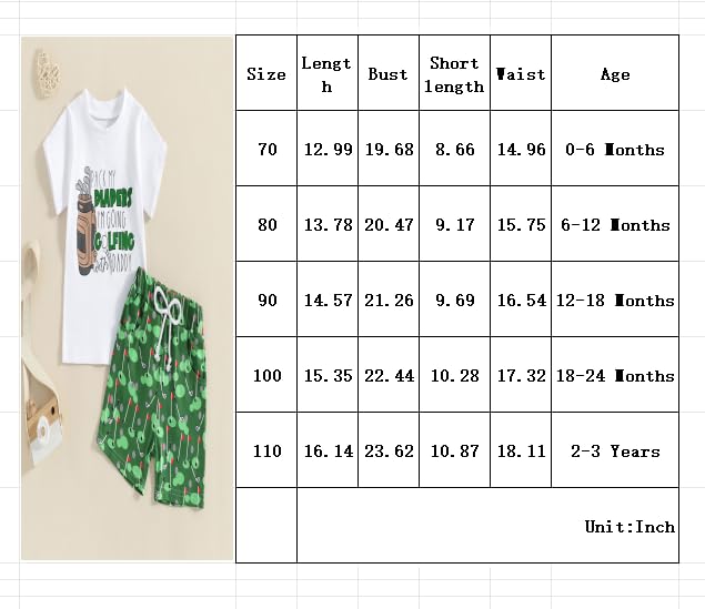 Fabric type: 95% Cotton, 5% PolyesterCare instructions: Dry Clean OnlyOrigin: Imported【Material】Toddler boy summer outfits, golf outfit baby boy, made of 95%cotton and 5%polyester. Super plush, smooth, durable, breathable, skin friendly and cozy. baby golf outfit, baby boy jogger shorts set, Perfect gift for your little one!【Design】Baby boy golf clothes, baby boy summer outfits. hole in one birthday outfit, Golf embroidered, i'am going golfing with daddy/daddy's future golfing buddy funny letter print, short sleeve crewneck tee shirt, elastic waist jogger shorts set, with two pockets, baby boy first birthday golf outfit, super adorable, your boy will get lots of compliments!【Age】Baby boy masters golf outfit, newborn golf outfit boy 0-6 Months newborn golf outfit boy, baby boy golf outfit 6-12 Months ,12-18 Months toddler golf outfit,18-24 Months boy shirts, and toddler golf clothes 2t, 2t boy shirts, 3t boys clothes summer. Please select suitable size according to our size chart before ordering !【Occasions】Toddler boy summer clothes shorts set, suitable for spring, fall, winter, Father's Day, birthday gifts, party, school, sports, vacation, beach, family gathering, photography props, holiday, casual, daily wear, indoor, outdoor, baby shower, coming home outfit, or just enjoying some golf on TV with Daddy!【Package Included】1 x Baby Boy Golfing with Daddy T-Shirt Top + 1 x Baby Boy Golf Print Shorts. If you have any questions, please feel free to contact our friendly customer service ! Perfect for everyday use. top-grade materials and excellent craftsmanship ensure long-lasting durability.