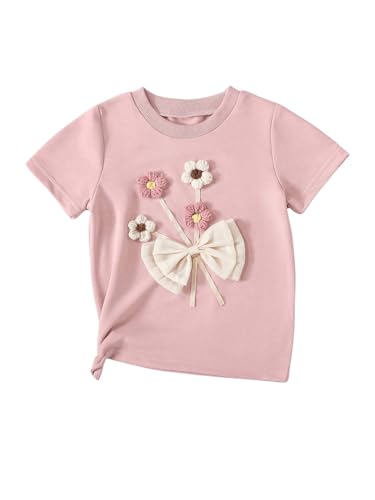 OYOANGLE Girl's 3D Flower Bow Knot Short Sleeve Round Neck T Shirt Soft Breathable Casual Tee Shirts 1