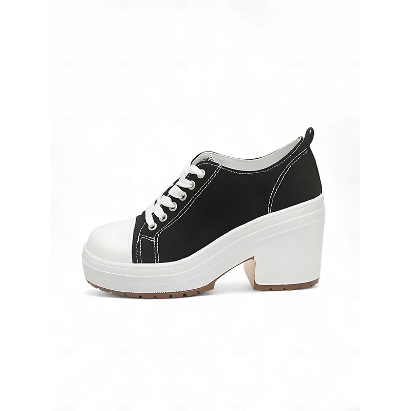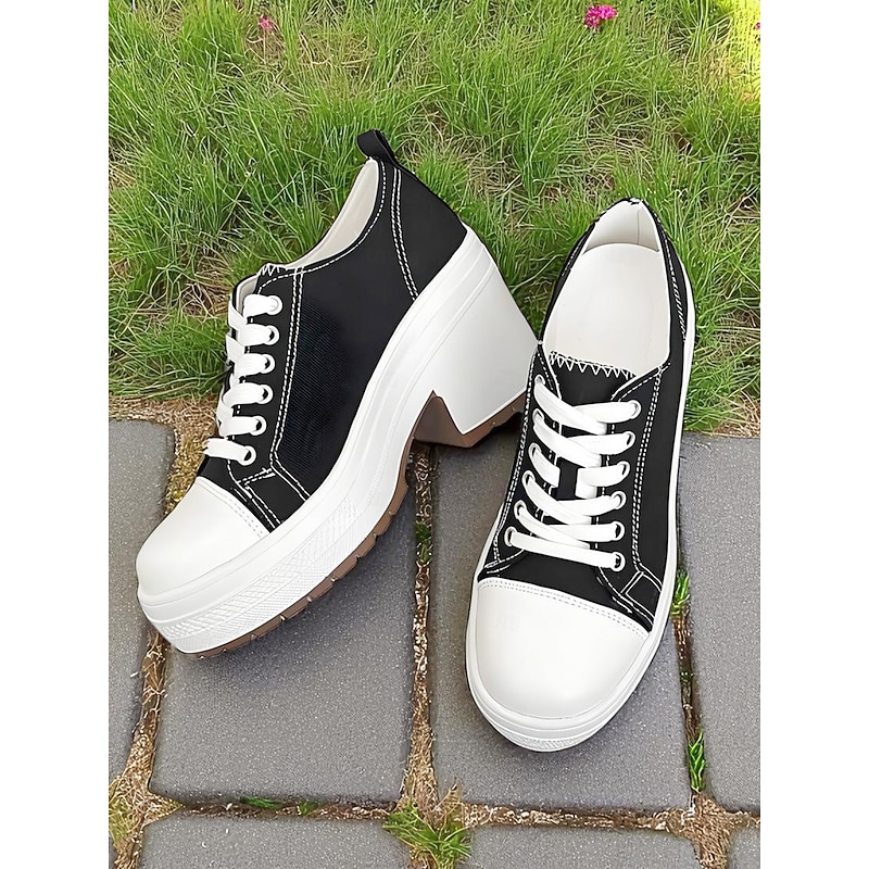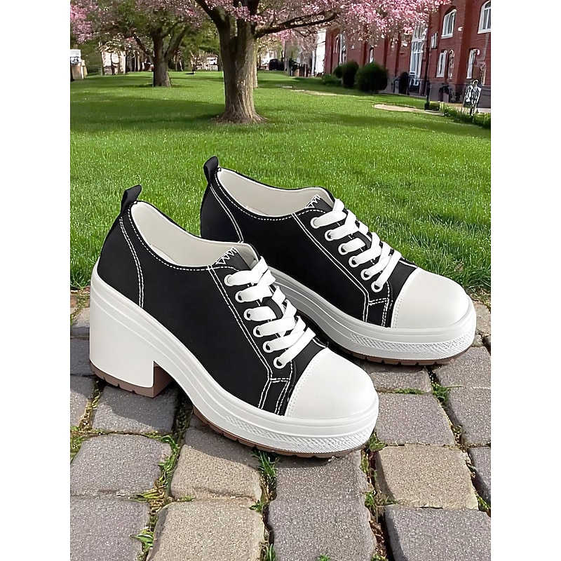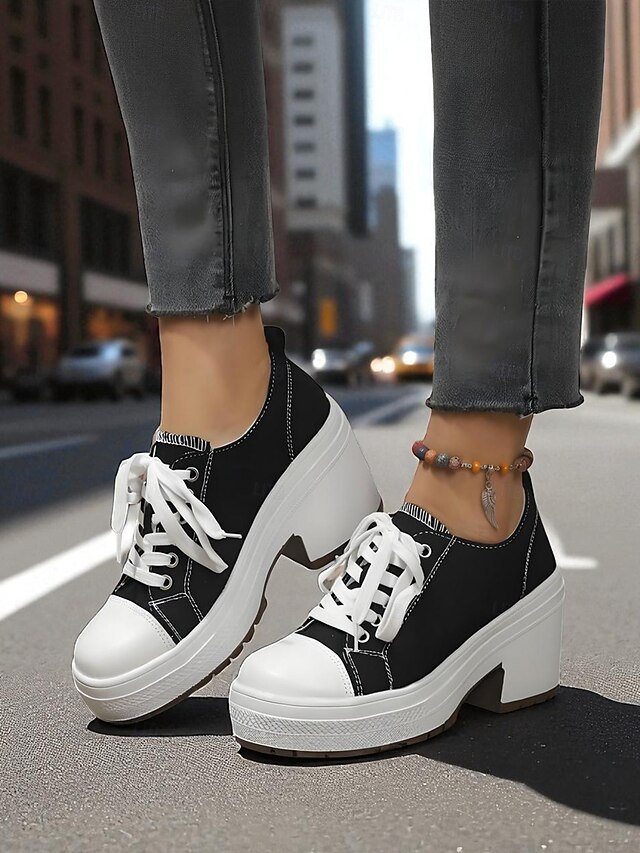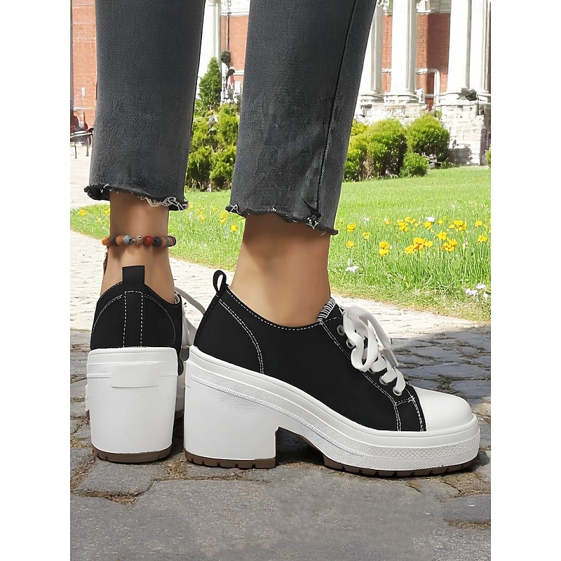 Women's Black Platform Chunky Heel Canvas Sneakers – Lace-Up Retro Street Style Shoes for Teens and Young Adults for Daily Walks Campus Life and Casual Outings 1