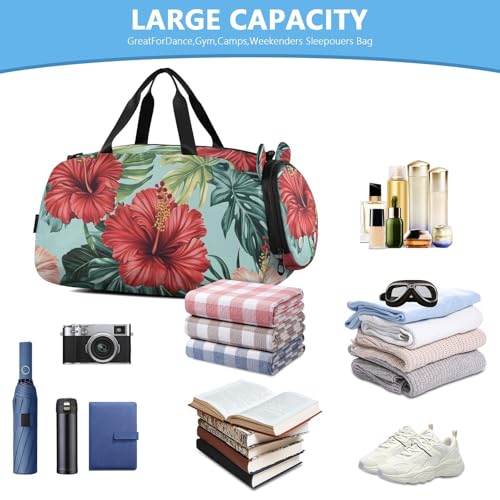 HOT ! Hibiscus Flowers Pattern Gym Travel Duffel Bag with Shoe Compartment for Boys Girls - Gymnastics Sports Dance Football Travel Bag Teens Weekender Sleepover