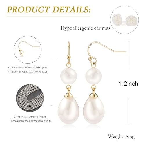 • [TOP QUALITY ] Pearl Dangle Earrings are crafted from Hypoallergenic 14K gold plated/ Sterling Silver with a Copper, the color is bright and sturdy; Lead-Free & Nickle-Free & Cadmium-free drop earrings are tarnish-resistant, water-resistant,great for sensitive ears.
