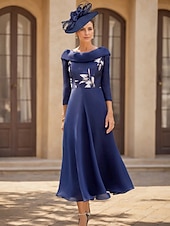 More information about A-Line Mother of the Bride Dress Wedding Guest Elegant Vintage Bateau Neck Ankle Length Chiffon 3/4 Length Sleeve with Flower Solid Color Wedding Guest Dress
