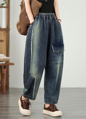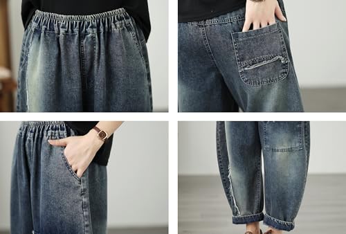 LAI MENG FIVE CATS Women's Baggy Jeans Pattern Elastic Waist Casual Harem Pants Barrel Denim 7
