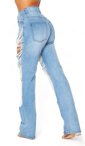 HOT ! Cut Out Jeans for Women Straight Leg Mid Waisted Ripped Rhinestone Pearl Beaded Denim Pants
