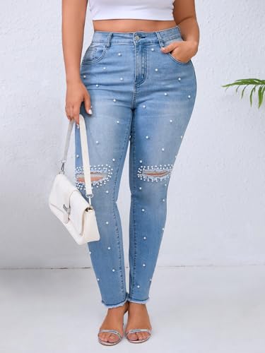 • Features: Slim fit; Imitation pearl beaded embellishments, Mid rise, Skinny-leg, Five pocket, Fringe tassels frayed, Zip fly and button closure. Rhinestone jeans for women; Booty lifting jeans for women; Sparkly jeans for women