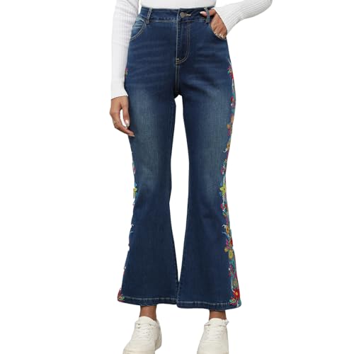 Grosy Boho Floral Embroidered Mom Jeans for Women Plus Size High Waisted Bell Bottom Bohemian Denim Pants Flare Jeans 6