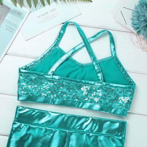 Kids Girls Dance Outfit Strappy Crop Top Sequin Dance Tank and Shiny Metallic Shorts Set Hip Hop Streetwear 6