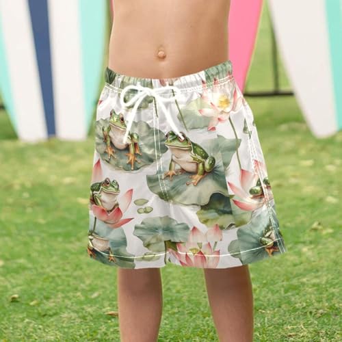 Pigsaly Boys' Swim Board Shorts Watercolor Cute Green Frogs Lotus Flowers Boy's Swim Trunks Kids Swimwear 3T 4