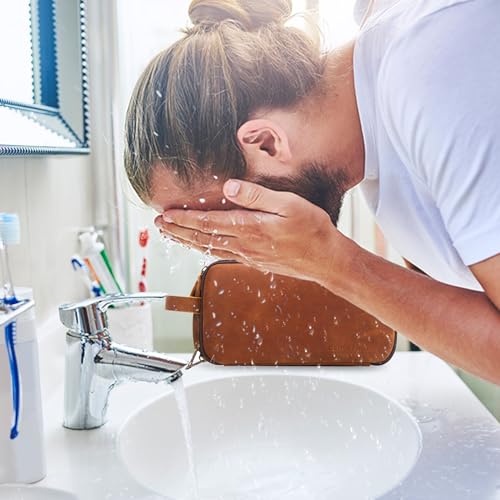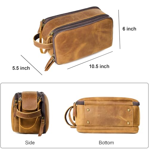 LARGE CAPACITY: Travel toiletry bag measures 10.5(L) x 5.5(W) x 6(H) inches, it is large and roomy to store all essentials during travel or home use. The travel bag has multiple internal compartments, convenient for you to sort and access. Easily fits all the toiletries, shaving kits, hair wax, shower gel, shampoo, toothbrushes and showering bathroom tools, etc. Essential organizer bag for business and travel.PREMIUM MATERIAL: Our mens toiletry travel bag made of full grain leather, water-resistant and durable, to protect your toiletries during travel. The toiletry bag also offers wet/dry separation so you can keep wet accessories in a separate compartment from dry toiletries. supreme bathroom bag makes your trip more convenient and enjoyable.modern RETRO DESIGN: This men's toiletry bag with retro color matching, appearing grand, fashionable, and high-end, perfect for carrying when going out. It has a side handle that can be easily hung in the bathroom or closet, packaging with dust bag, very convenient during your travel.PERFECT GIFT: This leather travel bags also cosmetic bag, it is an excellent travel accessory for men and women. The toiletry bag is easy to pack and fits well in luggage and backpacks, perfect for business trips, travel, gym, camping, and family outings. It is a great gift for men, women, father, uncle, husband, friends, and those who love to travel.100% SATISFACTION: We make sure that every customer gets a great buying experience. If you find any issue with this travel toiletry bag, please let us know immediately, we will give you a satisfactory solution. Perfect for everyday use. High quality materials and excellent craftsmanship ensure long-lasting durability.