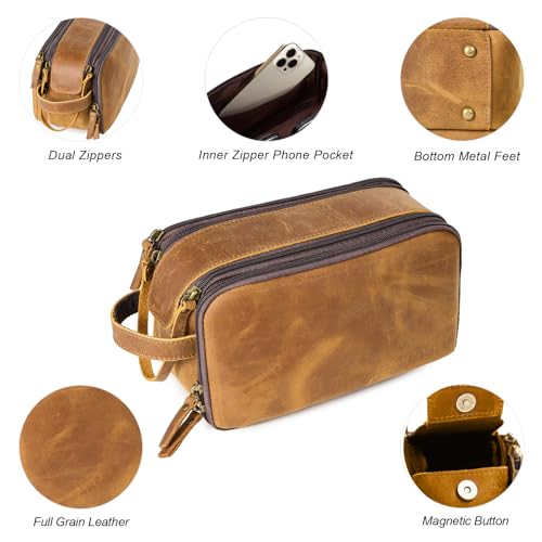 Toiletry Bag for Men, Full Grain Leather Travel Pouch Shaving Dopp Kit Bathroom Toiletries Organizer Bags, Brown