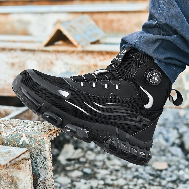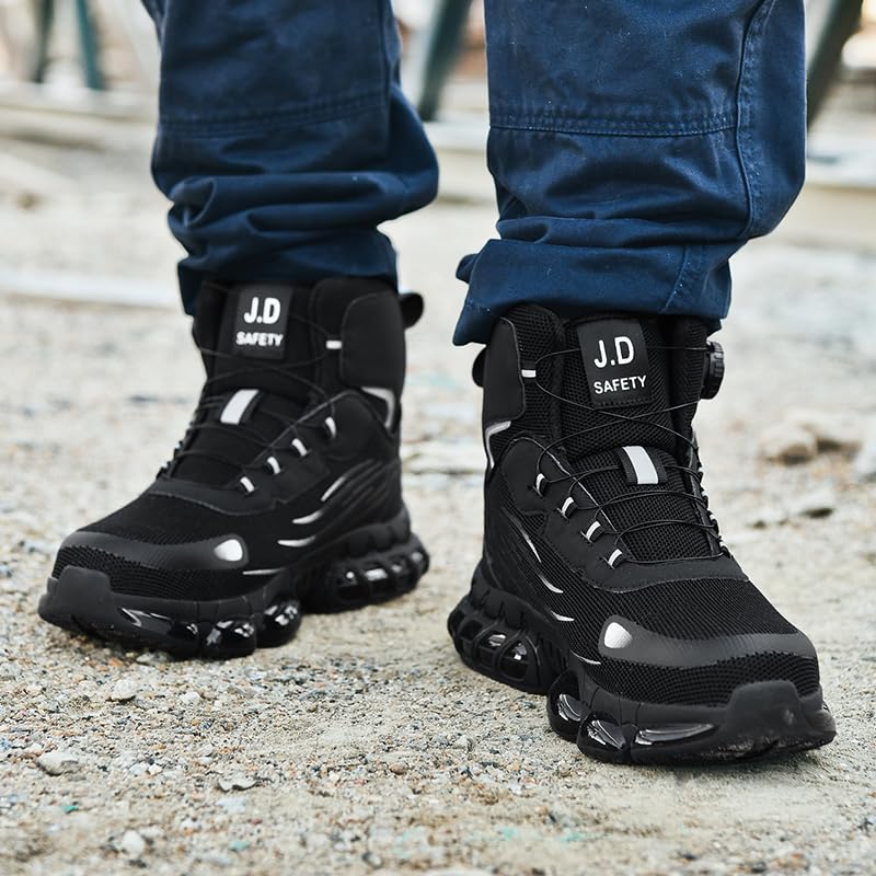 Sole material: RubberShaft height: 6Shaft circumference: 10.5 InchesOuter material: MeshSAFETY FEATURES: High-top work boots with steel toe protection and rugged construction for maximum workplace safety and protectionCOMFORT DESIGN: Breathable mesh upper with cushioned insole provides all-day comfort and ventilation during extended wearDURABLE BUILD: Heavy-duty rubber outsole with impact-resistant design offers excellent traction and stability on various work surfacesVERSATILE STYLE: Available in classic black and up-to-date gray color options, suitable for both industrial settings and casual wearPRACTICAL DETAILS: Quick-lace system with reinforced eyelets and padded collar for secure fit and easy on/off access Perfect for everyday use. top-grade materials and excellent craftsmanship ensure long-lasting durability.