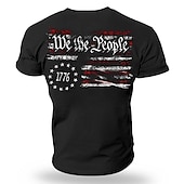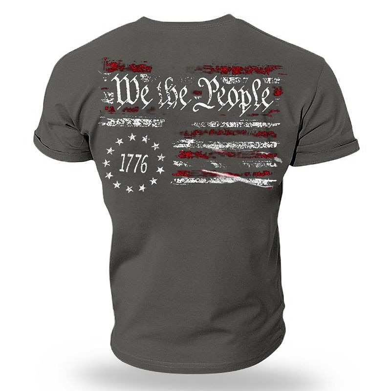 : The standout feature of this t-shirt is its graphic print design showcasing a stylized American flag and the text "We the People" alongside the year "1776" encircled by stars. This patriotic design exudes a vintage and distressed look, perfect for adding character and a sense of national pride to your outfit.