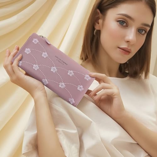 HOT ! Ladies Wallets, PU Leather Womens Wallet Credit Card Holder for Women and Girls, Long Wallet Women's Wallets with Flower Embroidery for Bank Cards, Cash, Receipts (pink)