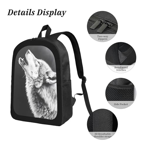 Howling Moon Wolf Grey 3 Pcs 17 Inches Backpack Set with Insulated Lunch Bag And Pencil Pouch Large Back Pack for Men Women Lunchbox Pencil Case Waterproof Backpacks Lunch Box 3 Piece Daypacks 7