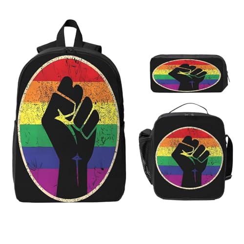 LGBT Rainbow Gay Pride Flag Hands clenched fist support 17 Inch Backpack Sets Lunch Bag Lightweight Daypack for Men Women 3Pcs 3