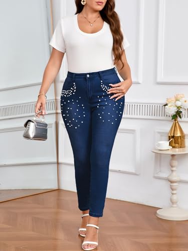 Women's Pearl Beaded Jeans Mid Rise Stretchy Skinny Denim Pants Slimming Fit Jean Bottoms 6