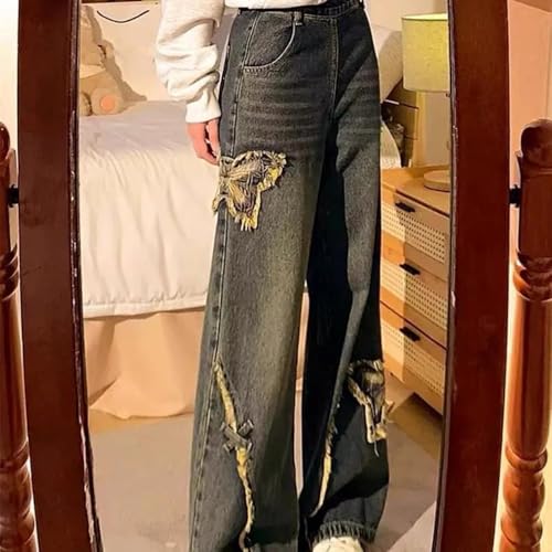 Women's Daily Casual Pants American high Street y2k Commuting Style Butterfly Embroidery Retro Blue Jeans 1