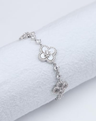 Material: MetalMetal type: CopperClasp type: Lobster ClawChain type: Cable ChainGem type: Cubic ZirconiaColor: This bracelet comes in three color options: silver, a blend of silver and pink, and gold, allowing you to choose according to your preference.Material: This four-leaf clover bracelet is made of copper and features an advanced electroplating process, making it shimmer brilliantly under the light.Charm:The four-leaf clover pendant on this bracelet features premium mother-of-pearl leaves, with high-quality zircon stones set at the center and along the leaf edges. The combination of these exquisite materials creates an elegant yet minimalist aesthetic.outstanding Gifts: The four-leaf clover, also known as the lucky clover, is a universal symbol of good fortune. What other piece of jewelry could possibly surpass it as the ideal gift choice? That's why this four-leaf clover bracelet makes the perfect present for Christmas, birthdays, Mother's Day, Valentine's Day - truly any occasion worth celebrating.Customer Services: If you have any questions about this clover bracelet for women, feel free to reach out—we're always here for you! Perfect for everyday use. supreme materials and excellent craftsmanship ensure long-lasting durability.