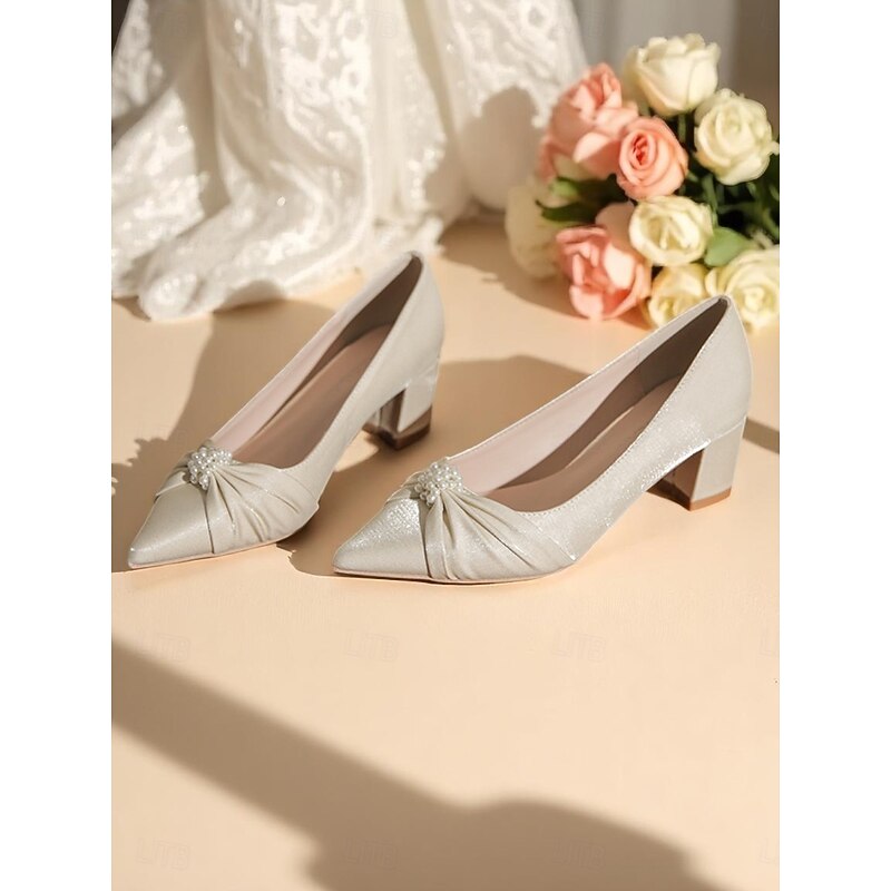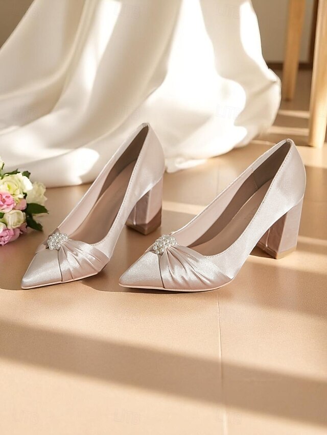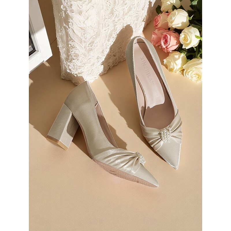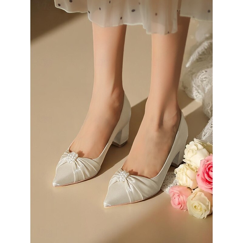 More information about Women's Ivory Satin Block Heel Wedding Pumps, Pointed Toe Pearl Embellished Formal Bridal Shoes for Elegant Ceremonies
