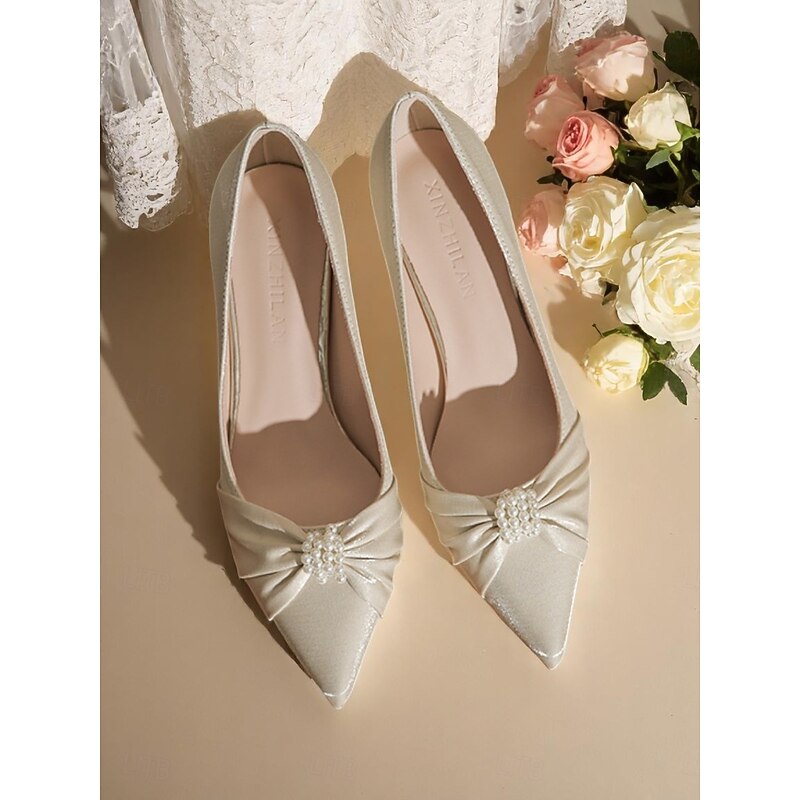 HOT ! Women's Ivory Satin Block Heel Wedding Pumps, Pointed Toe Pearl Embellished Formal Bridal Shoes for Elegant Ceremonies