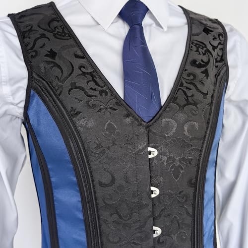 • Note:This is not The USA size, kindlpy please refer to the size chart picture in the page Material Composition: This corset vest for men,the fabric undergoes a composite process, making the vest more sturdy and stylish,with exquisite workmanship,V neck,metal buckles, laces up at back, 12 bones, exquisite floral print at middle,elegant blue at waist,mixed black trims. This dress waiscoat is idea choice for any outfits and shirts