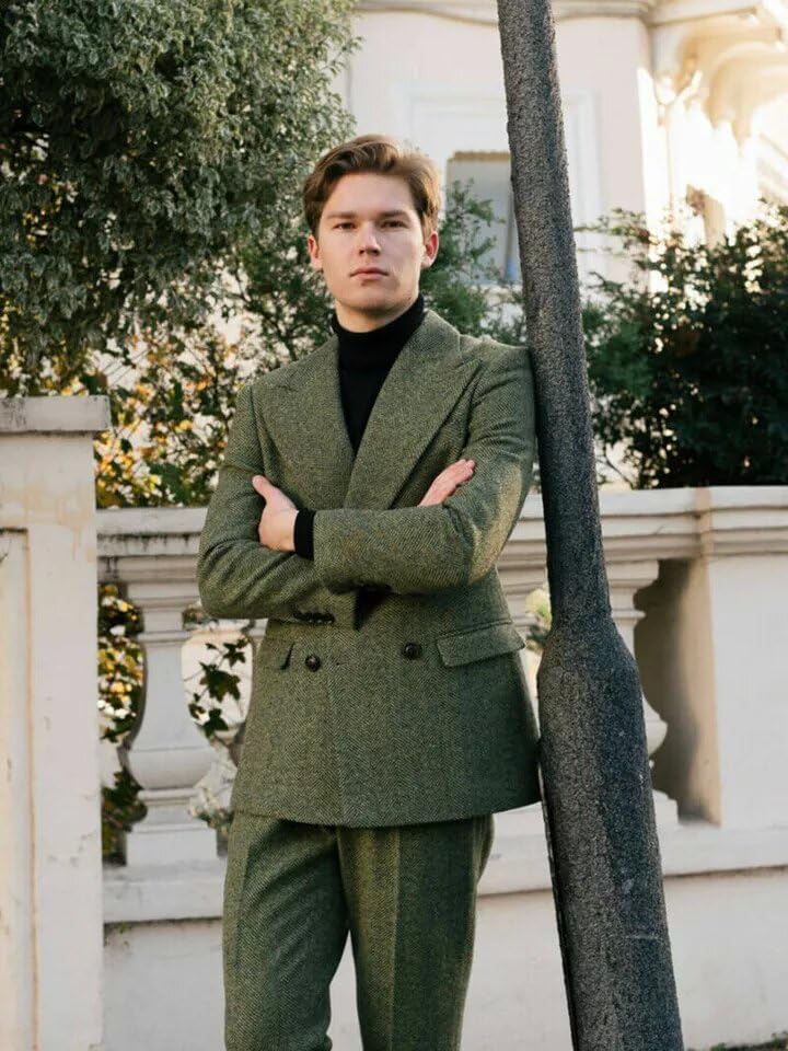 Men's 2 Piece Tweed Herringbone Vintage Suit Double-Breasted Tuxedo Set Party Wedding Dress Blazer and Trousers 3
