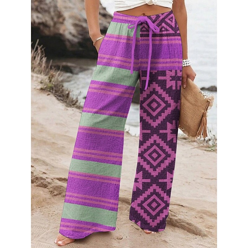 Women's Wide Leg Pants Trousers Retro Vintage Long High Waist Geometic Elastic Waist Printing High Cut Breathability Soft Micro-elastic Vacation Street Daily Wear Blue Purple Fuchsia Orange Spring 7