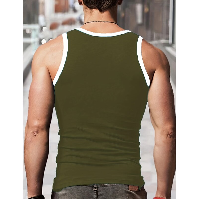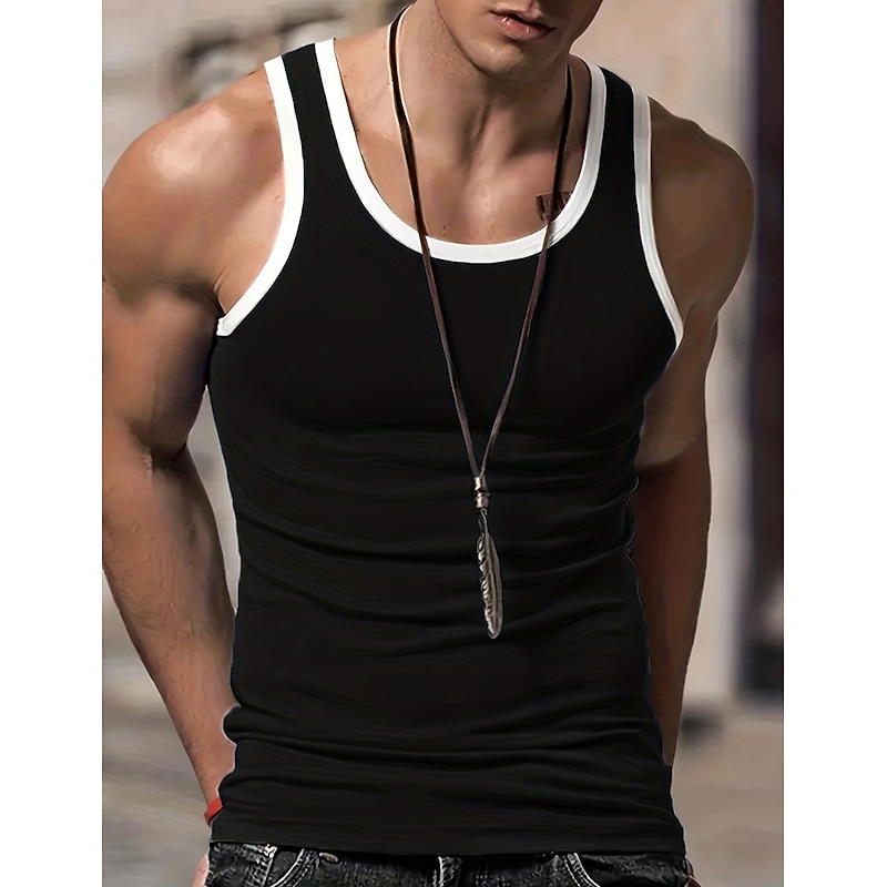 Highlights [Fabric] : This men's tank top is crafted from a high-quality polyester fabric, known for its durability and lightweight properties. The breathable material ensures comfort, making it perfect for warmer seasons and active lifestyles. [Fit] : Designed with a sleek, muscle fit, this tank top hugs the body to enhance the physique, providing a stylish yet comfortable wear. Its modern cut ensures it complements athletic builds while allowing freedom of movement. [Design Highlights] : The tank top features a classic U-neckline with contrasting color block style, utilizing white piping along the neckline and armholes to add a contemporary touch. This design not only adds visual appeal but also enhances the definition of the shoulders and arms. [Occasions] : Ideal for a variety of settings, this versatile tank top suits outdoor activities, casual outings, gym sessions, or any social gatherings. It's a fashionable choice for those who appreciate designer aesthetics in everyday wear. [Size Range] : Available in a comprehensive range of sizes, from S to 3XL, ensuring a perfect fit for different body types. It caters to a broad audience, making it easy to find the right size for your needs.