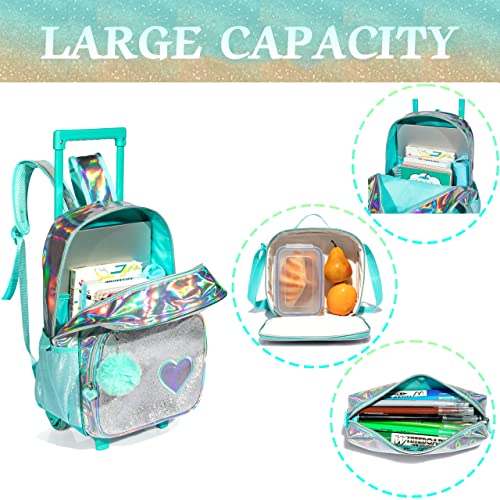 • Capacity: Rolling backpack for girls with 2-compartment, main pocket could hold textbooks or workbooks, the front small pocket with pen holders, card slots for keeping small items safe, 2 meshed side pockets can easily hold water bottle or umbrella. 1 pencil case and 1 lunch bag with adjustable straps.