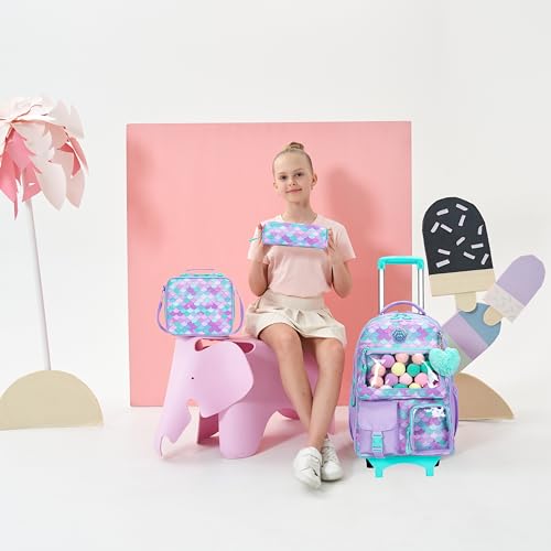 Girls 3 in 1 Rolling Backpack for School Girls Backpack with Wheels Girls Backpack with Lunch Box Set Kids Suitcase for Girls Elementary School Roller Bookbag Kids Travel bag with Wheels 5