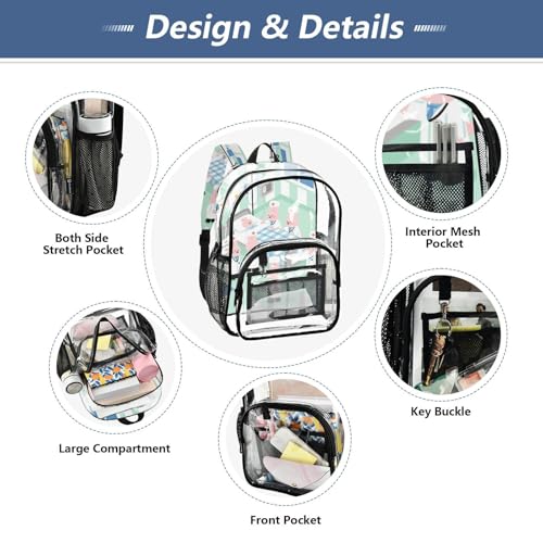 • Size: Measuring 10.6 x 7 x 15.7 inches,Our Clear Backpack For School includes a main compartment, a medium front compartment features with mesh slots and key buckle for small items. Plus, the see through backpack offers two side mesh pockets for water bottles or umbrellas.